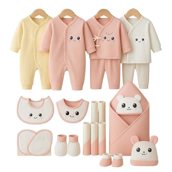 - Premium 23-Piece Newborn Hamper: Beautifully curated organic cotton gift set featuring pillow, mittens, gloves, swaddle, belt, button rompers, lace shirts, diaper-changeable pant, full pant, cap, napkins & bibs.