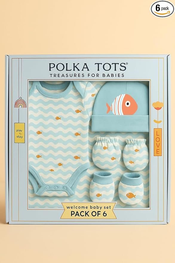 - Combo Set with Coordinated Must-Haves Includes 6 essential items in one thoughtfully curated box: 1 Onesie 1 Bottom 1 Cap 1 Pair of Booties 1 Pair of Mittens 1 Bandana Bib