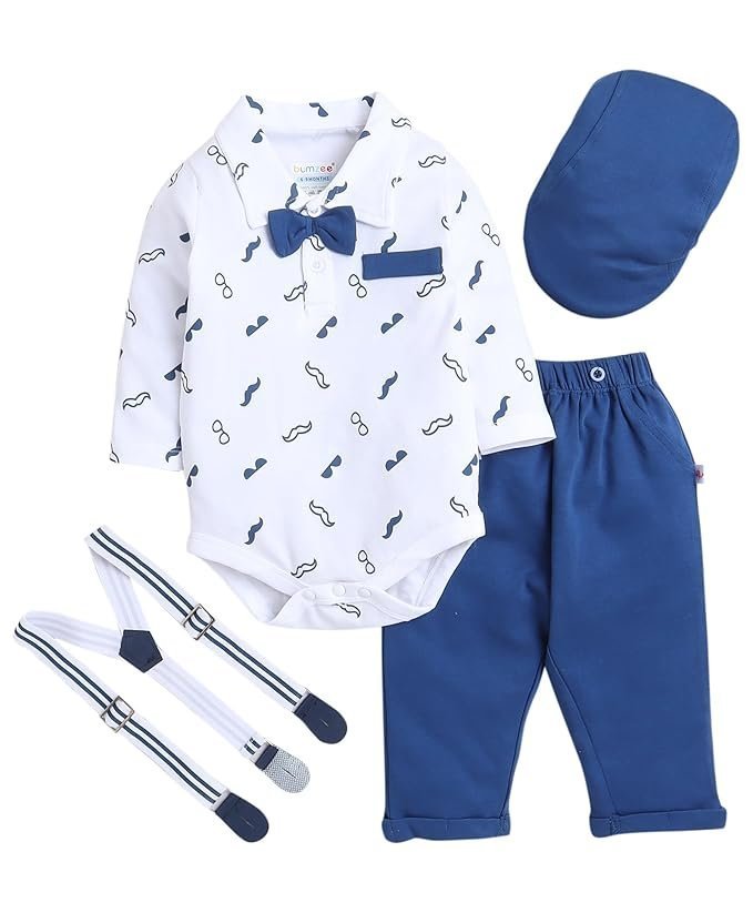 BUMZEE Boy’s Cotton Printed Full Sleeves Bodysuit Pant Set With Suspender & Cap