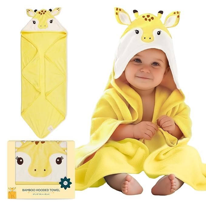 - INCLUDES: 1 hooded towel (38″ x 38″) in cheerful yellow, featuring an adorable giraffe design on the hood.