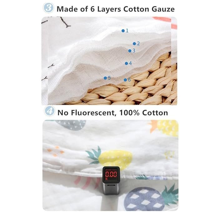 Material: Premium Quality Super soft Organic pure muslin cotton high quality,super absorbent 6 Layer.